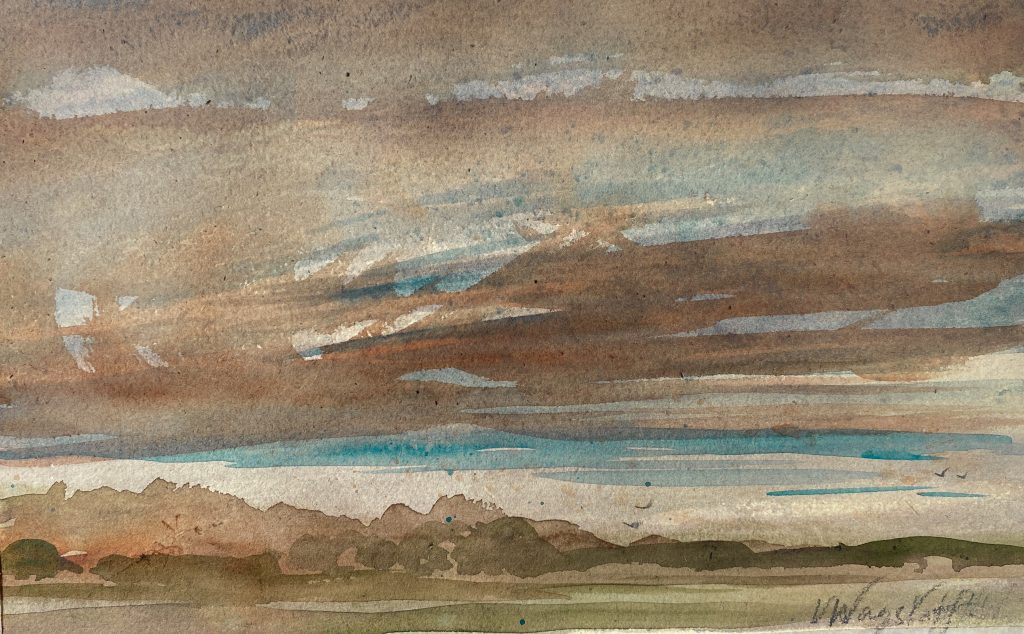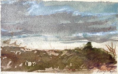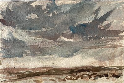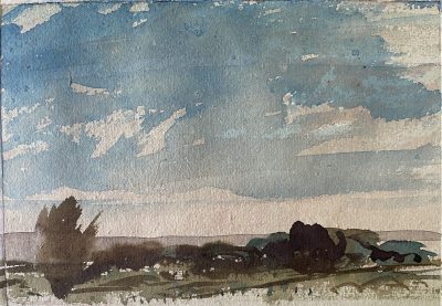 Below: Various Sussex watercolour landscapes and skies on heavy cream beige paper at 10/7/8 x 5/6 inches, private sketches (signed pencil nr margin) show a current working exploratory process. A selection are available for purchase (earlier works have sold) at the Adams gallery, Reigate, so do make your enquiries with them, more to come later.